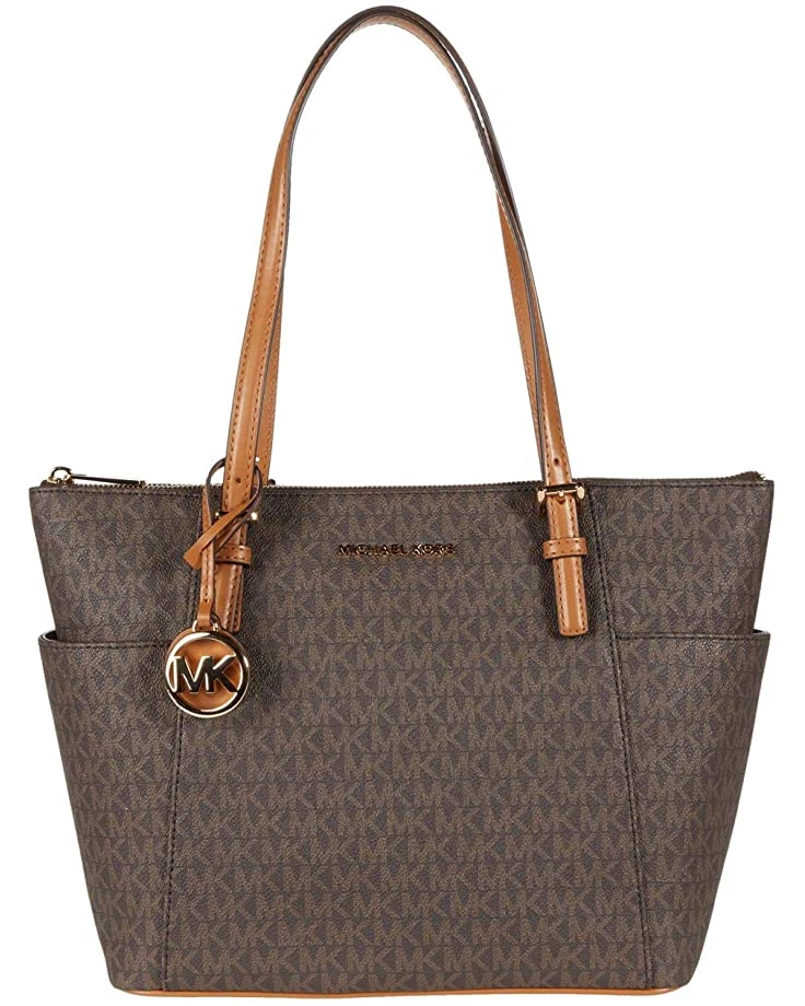 - The MICHAEL Michael Kors® Jet Set Item East/West Top Zip Tote features a monogrammed leather exterior, dual adjustable flat shoulder straps, top zip closure, and side exterior slip pockets.